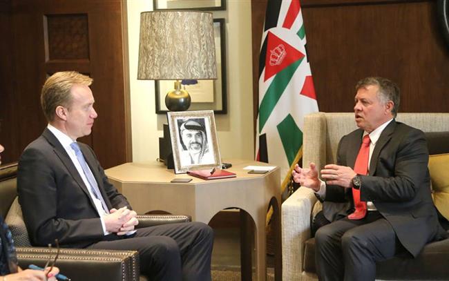من جانب آخر، بحث جلالة الملك، في لقاء منفصل، مع وزير خارجية النرويج بورغ برنده، الجهود المبذولة للتعامل مع الأزمات التي يمر بها الشرق الأوسط، خصوصا سبل حل الأزمة السورية وإحياء مفاوضات السلام بين الفلسطينيين والإسرائيليين.