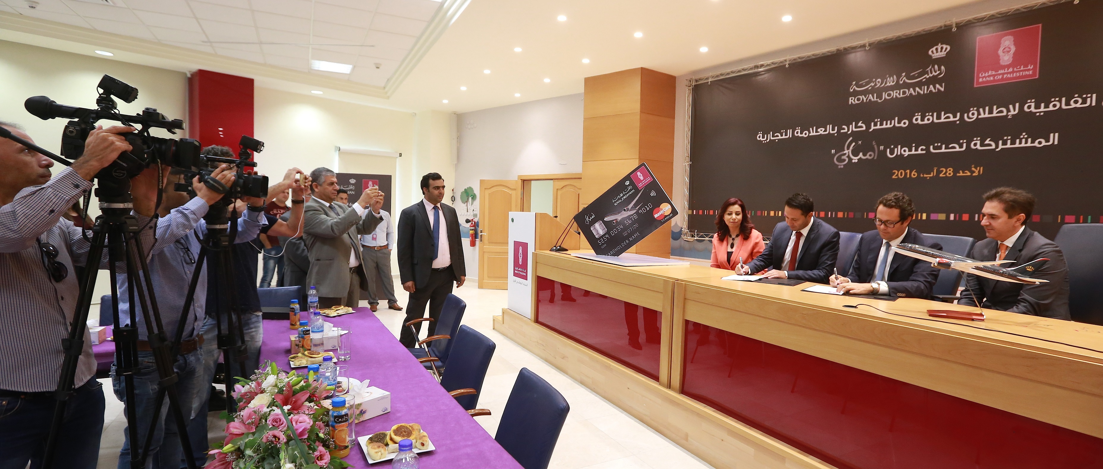وجرى توقيع الاتفاقية في المركز الرئيسي للإدارة العامة لبنك فلسطين في مدينة رام الله، بحضور رئيس مجلس الإدارة والمدير العام لبنك فلسطين هاشم الشوا ورئيس القطاع التجاري في الملكية الاردنية سيرفر آيدن ومدير شركة "ماستر كارد" في منطقة المشرق العربي باسل التل، وعدد من أعضاء مجلس الإدارة، والإدارة التنفيذية ومسؤولين من كلا الطرفين، بالإضافة الى ممثلي وسائل الصحافة والاعلام.
