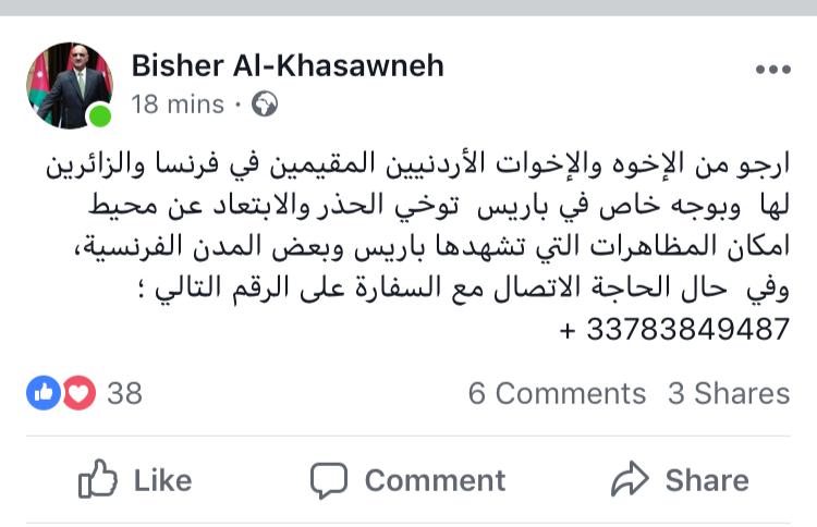 عمون- حذر السفير الاردني في باريس بشر الخصاونة الاردنيين المقيمين في فرنسا من التواجد في مناطق المظاهرات في المدن الفرنسية. |
