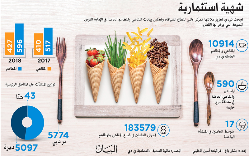 وأظهر تقرير قطاع الترخيص والتسجيل التجاري أن إجمالي العاملين في قطاع المطاعم والمقاهي بدبي يصل إلى 183579 عاملاً بمعدل 17 عاملاً في كل منشأة.