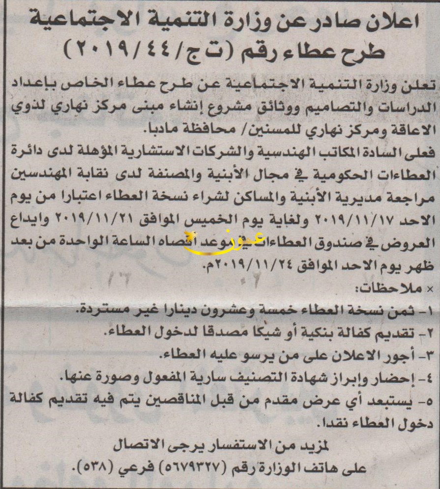 مطلوب اعداد دراسات لانشاء مبنى - وزارة التنمية الاجتماعية