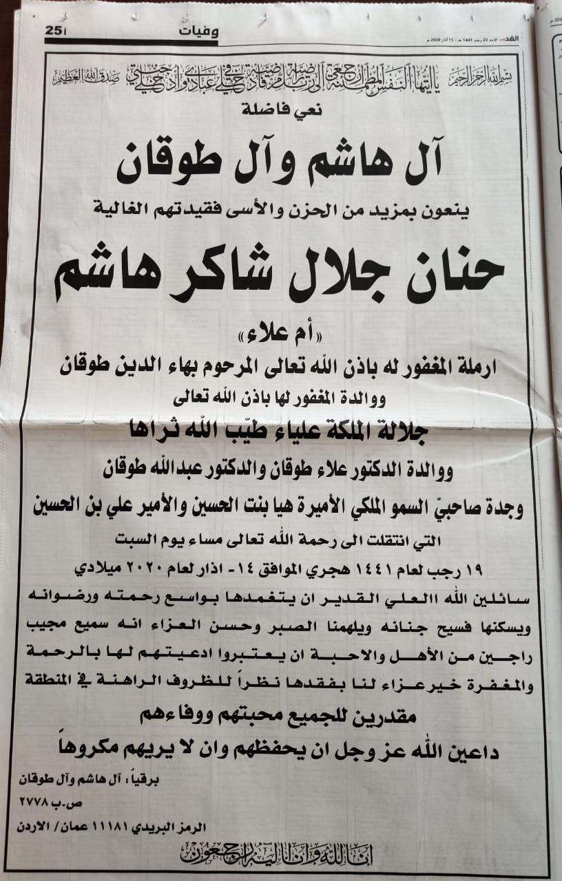 عبد الفتاح طوقان ينعى حنان هاشم جدة الأميرين علي وهيا16-03-2020 05:40 PM