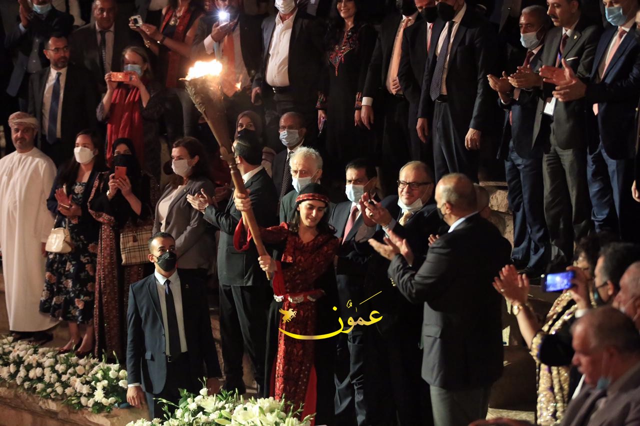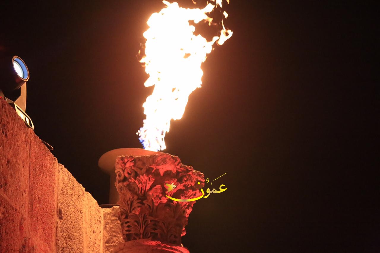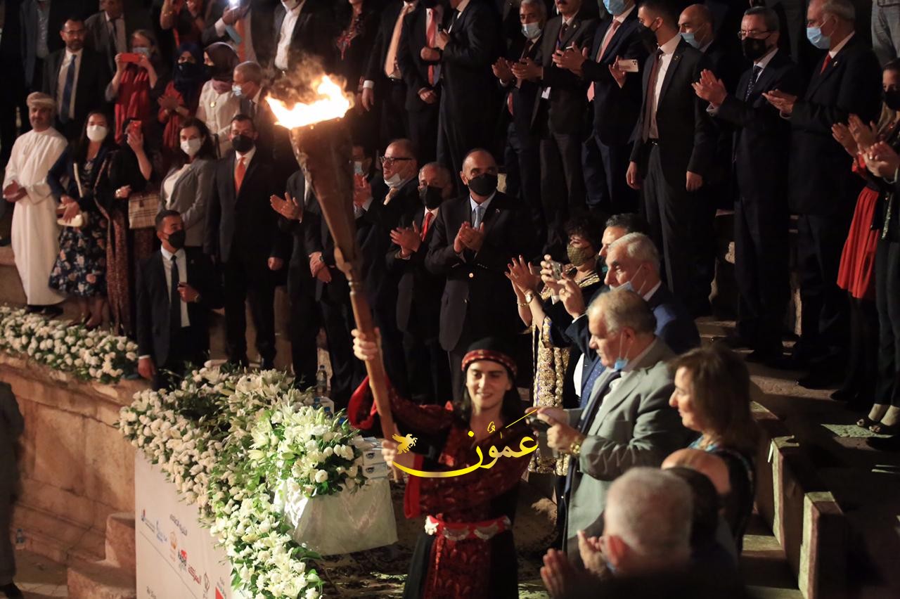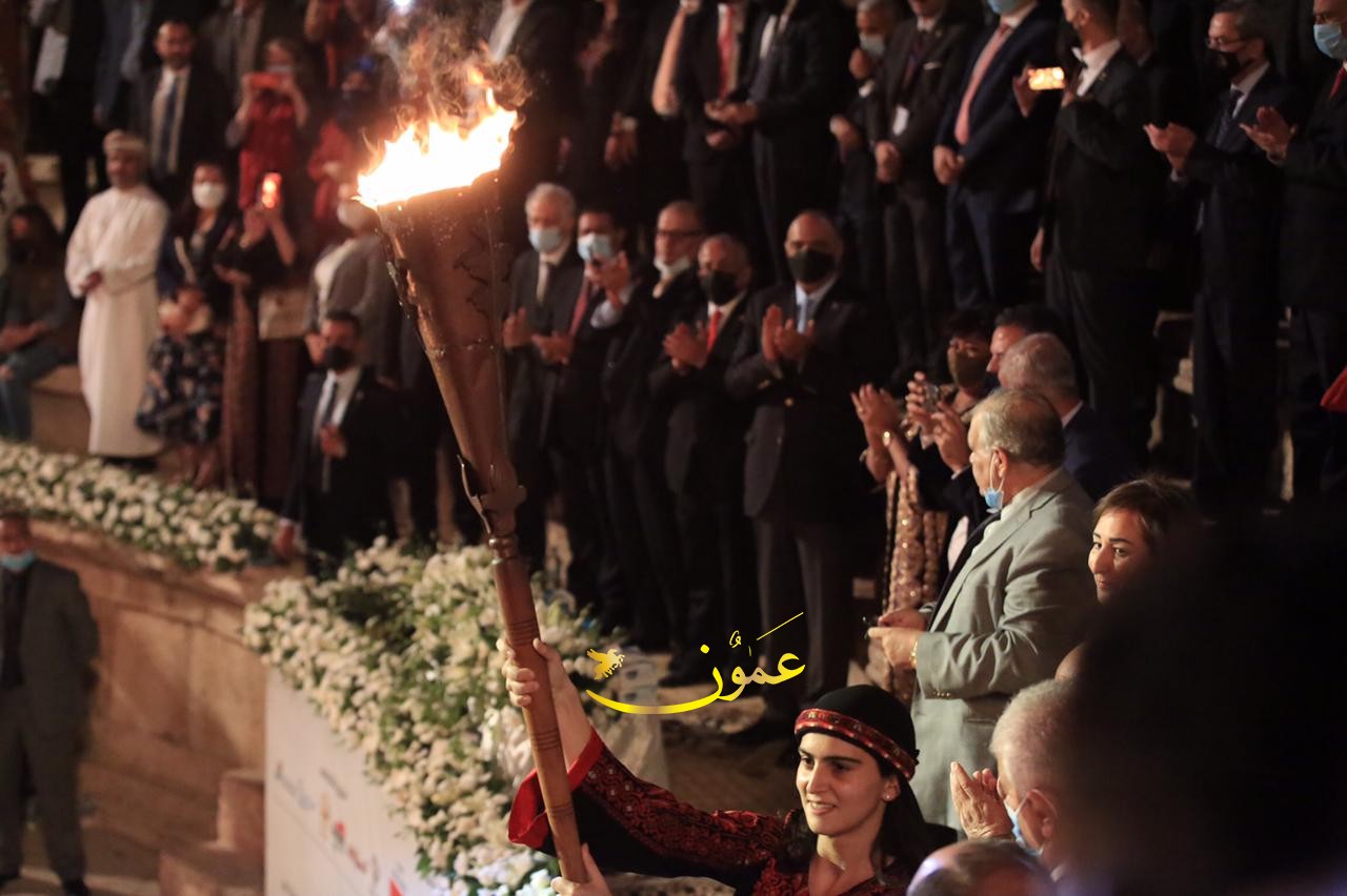 وبعد انتهاء الاستعراض اوقد راعي الحفل شعلة المهرجان معلنا انطلاق الفعاليات، وفي هذه الاثناء تقدم الفرقة الاستعراضية لوحة فنية راقصة بالمشاعل في تاكيد واضح على استمرار الفعل الثقافي والفني في جرش المدينة التي لا ينقطع عنها الابداع ولا تتوقف فيها مسيرة الفن ومشاعل النور، ثم الانتقال للوحة تؤكد السوسنة الوطنية قبل ان تنطلق المغناة الوطنية "مع عبدالله".