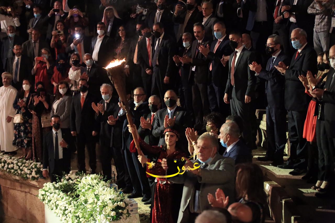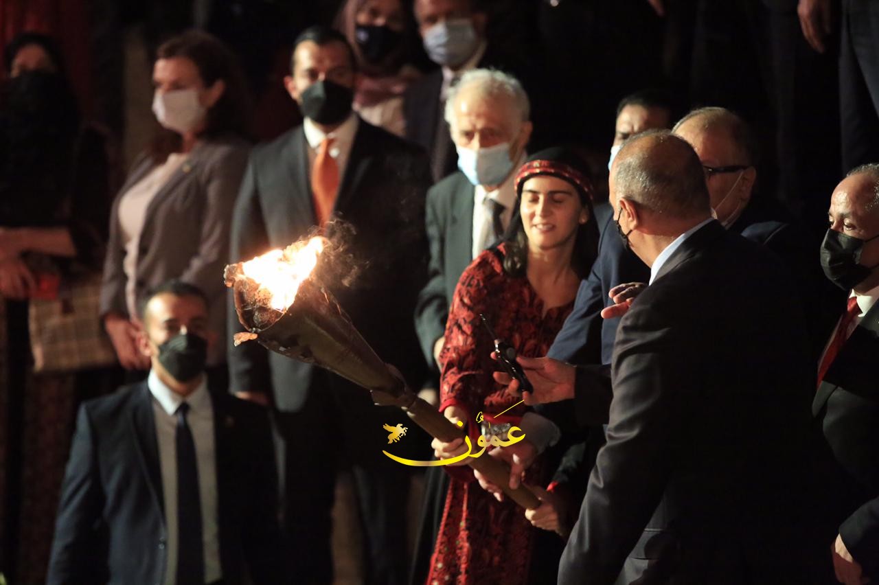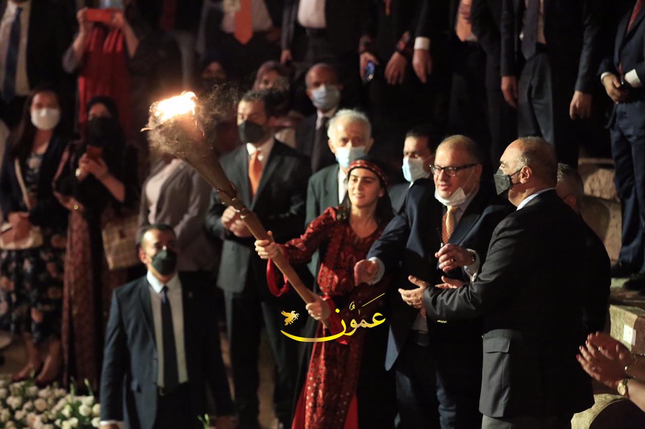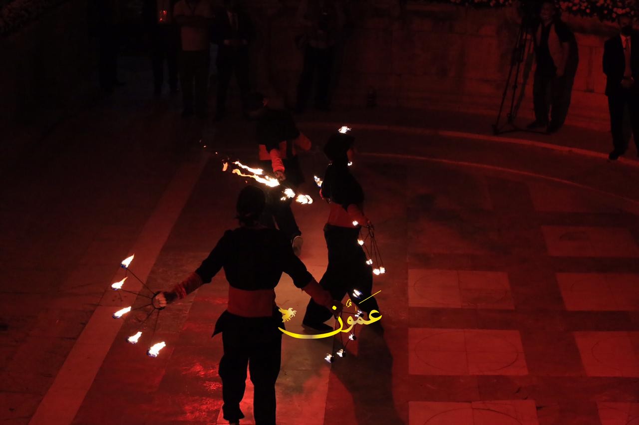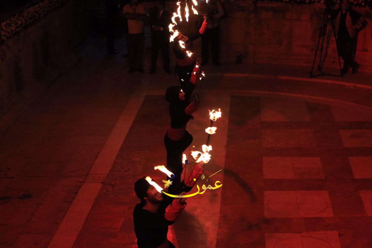 وبعد انتهاء الاستعراض اوقد راعي الحفل شعلة المهرجان معلنا انطلاق الفعاليات، وفي هذه الاثناء تقدم الفرقة الاستعراضية لوحة فنية راقصة بالمشاعل في تاكيد واضح على استمرار الفعل الثقافي والفني في جرش المدينة التي لا ينقطع عنها الابداع ولا تتوقف فيها مسيرة الفن ومشاعل النور، ثم الانتقال للوحة تؤكد السوسنة الوطنية قبل ان تنطلق المغناة الوطنية "مع عبدالله".