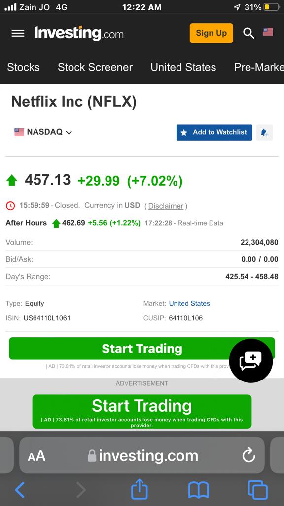 عمون - شهد سهم شركة نتفليكس العالمية ارتفاعا بمقدار 71 دولارا خلال 48 ساعة.