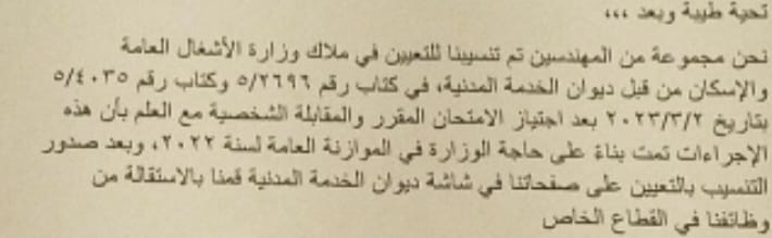 وأشار إلى أن وزارة الأشغال لم تقم بتعيين أي مهندس منذ 2019 نهائيًا في المركز او المديريات او الدوائر التابعة لها، لافتا إلى أنه لا يعقل خلال 3 سنوات لا يوجد شواغر لهم.