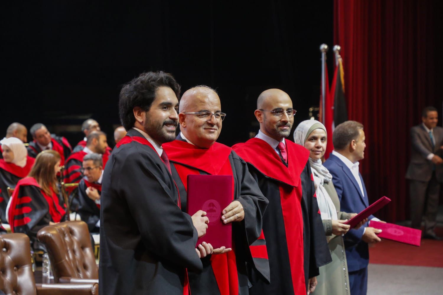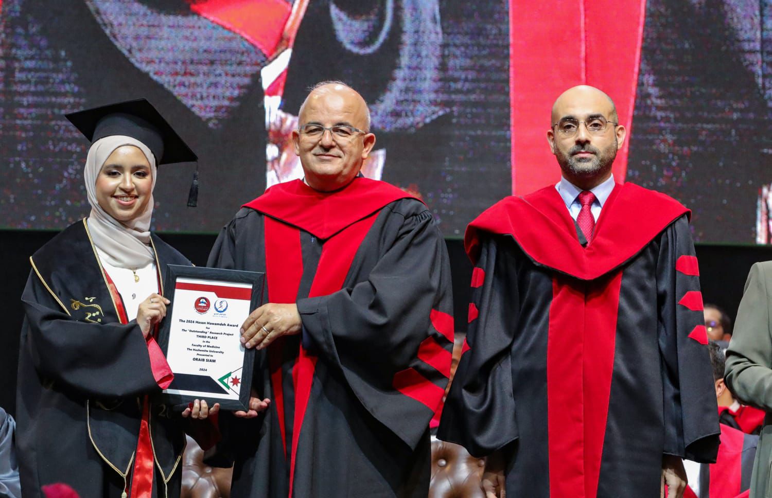 كما تم خلال الحفل تقديم دروع تكريمية للفائزين بجائزة الدكتور حسن الحوامدة للبحث المتميز التي تهدف إلى تشجيع الطلبة على التميز في البحث العلمي، وكذلك للعشرة الأوائل من الخريجين.
