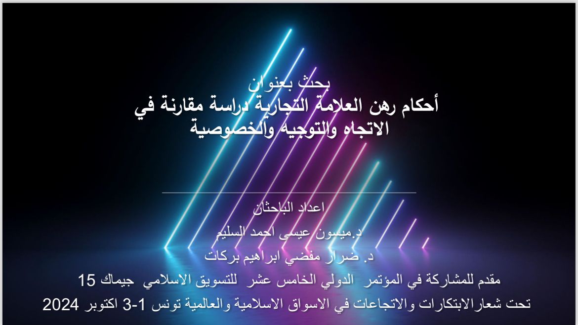 وقد قدّم الباحثان بحثاً مشتركاً بعنوان "أحكام رهن العلامة التجارية: دراسة مقارنة في الاتجاه والتوجيه والخصوصية"، حيث استعرضا خلاله الأطر القانونية لرهن العلامات التجارية، مع التركيز على التحديات والفرص في هذا المجال الحيوي. لاقى البحث اهتماماً واسعاً من المشاركين، خاصة في ضوء المناقشات المعمقة حول حقوق الملكية الفكرية والتطورات المتعلقة بحماية العلامات التجارية.