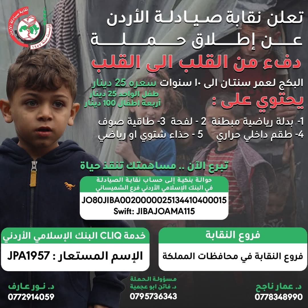 عمون - أعلنت نقابة صيادلة الأردن عن إطلاق حملة إنسانية جديدة تحت شعار "دفء من القلب إلى القلب"، والتي تهدف إلى جمع التبرعات النقدية لشراء ملابس شتوية ومستلزمات فصل الشتاء للأطفال في قطاع غزة، في ظل الظروف القاسية التي يمر بها القطاع نتيجة العدوان الصهيوني الغاشم.
