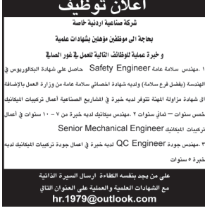 مطلوب مهندسين للعمل لدى شركة صناعية