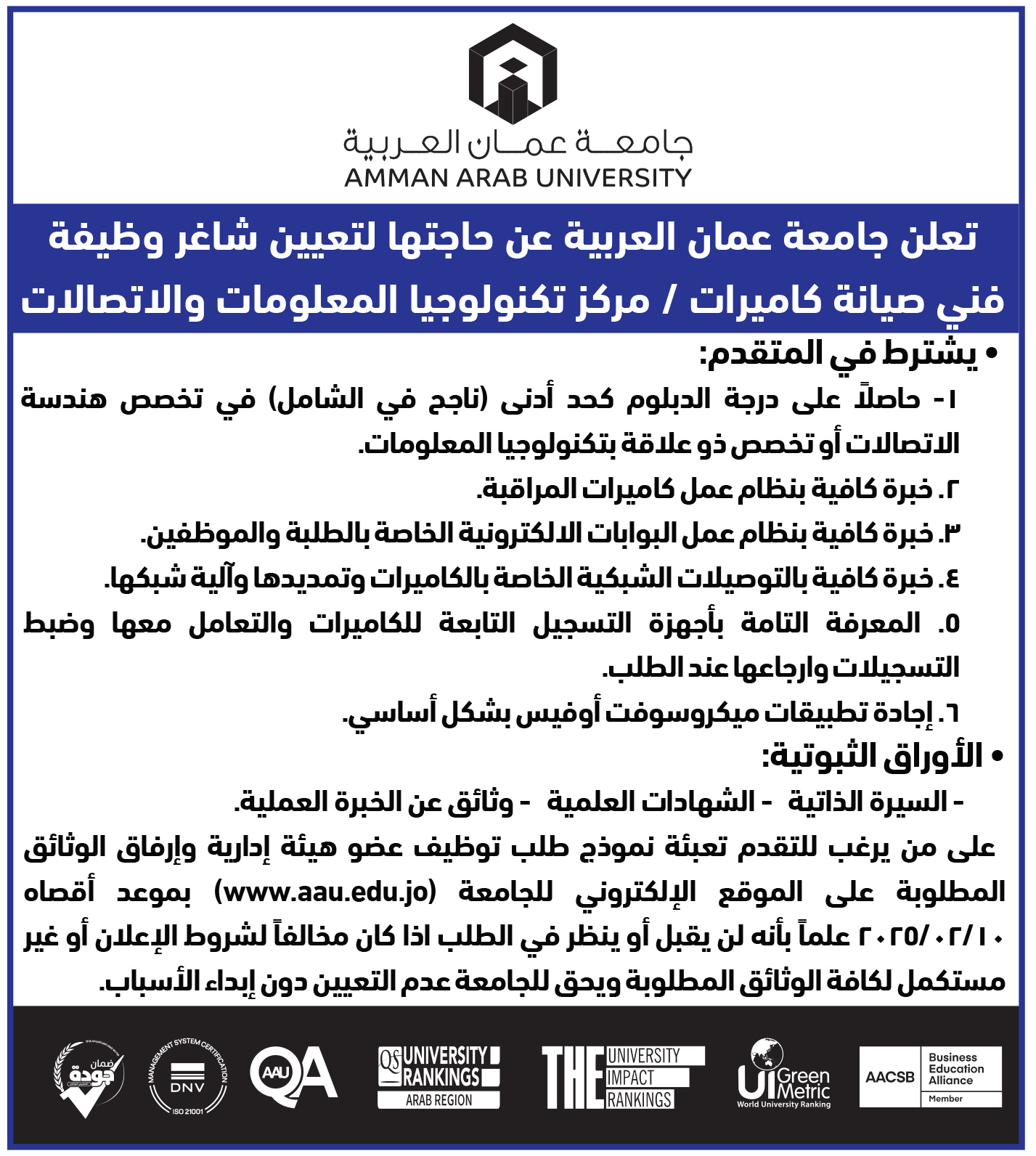 عمون - تعلن جامعة عمان العربية عن حاجتها لتعيين شواغر وظيفة فني صيانة كاميرات/ مركز تكنولوجيا المعلومات والاتصالات |