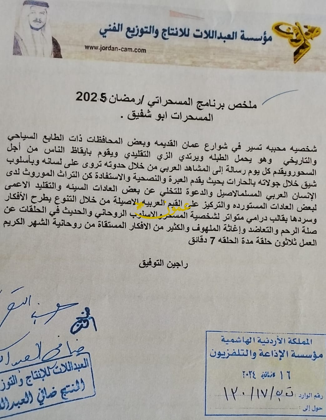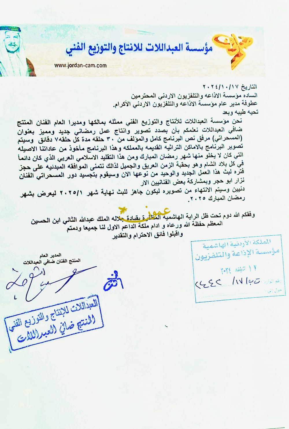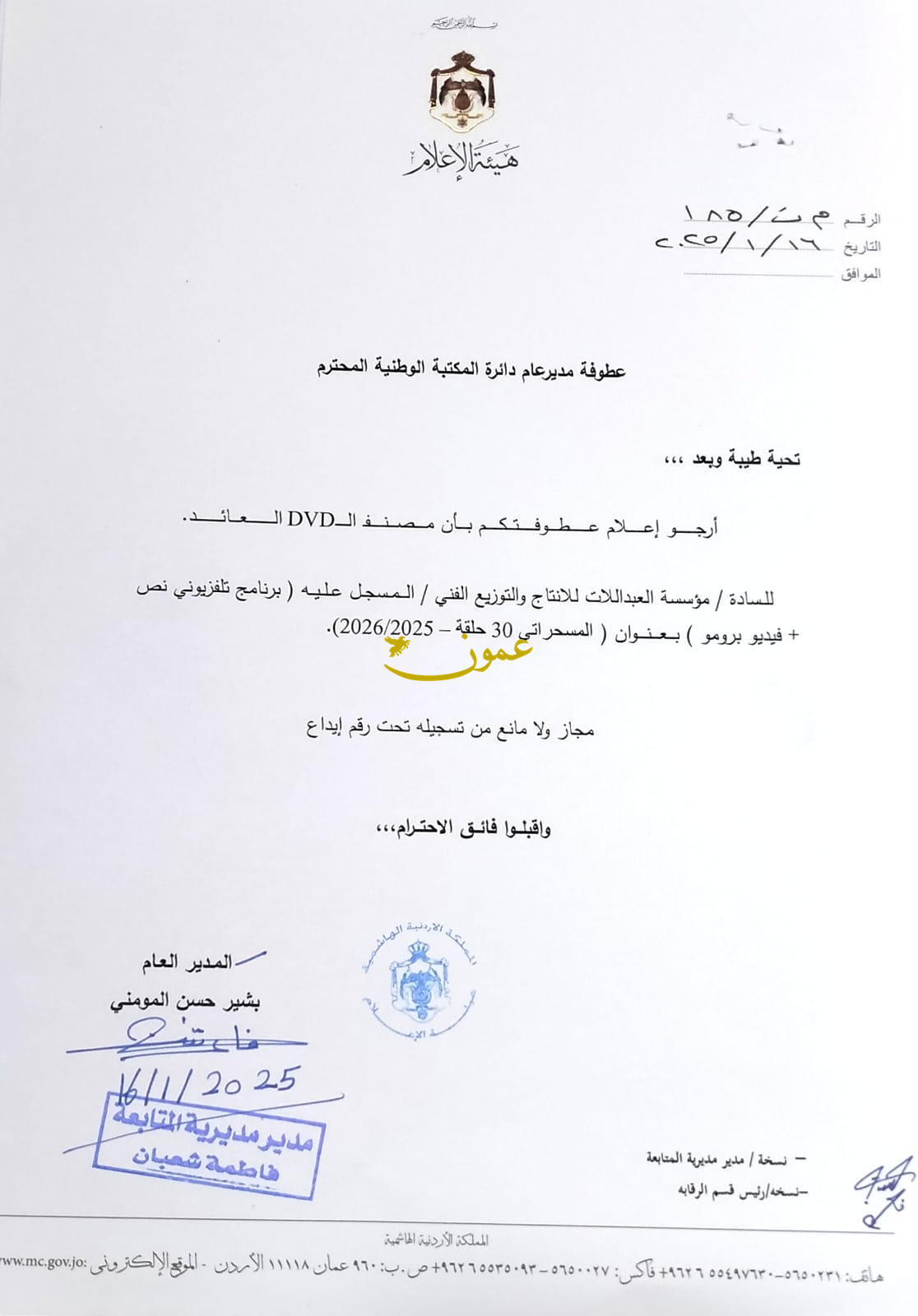 واستعرض منتج العمل العبداللات كتبا ووثائق تثبت حصول العمل على الاجازات والموافقات، وتقديم النصوص قبل البدء بالتصوير، والمتابعة حتى الانتهاء منه.