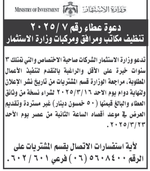 عطاء شراء خدمات التنظيف لمكاتب ومرافق وزارة الاستثمار