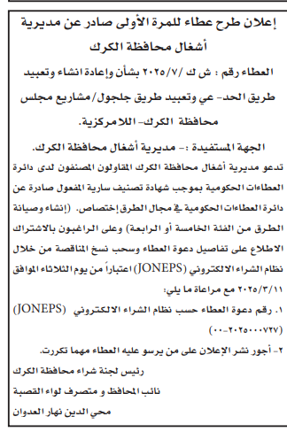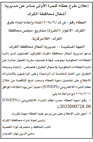 عطاء انشاء واعادة تأهيل طرق صادر عن مديرية اشغال الكرك