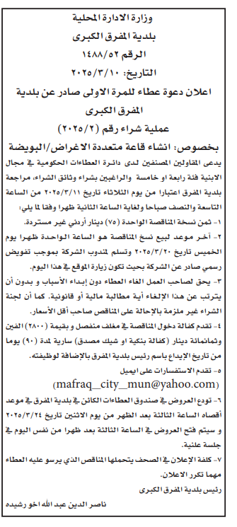 عطاء انشاء صالة متعددة الاغراض لبلدية المفرق
