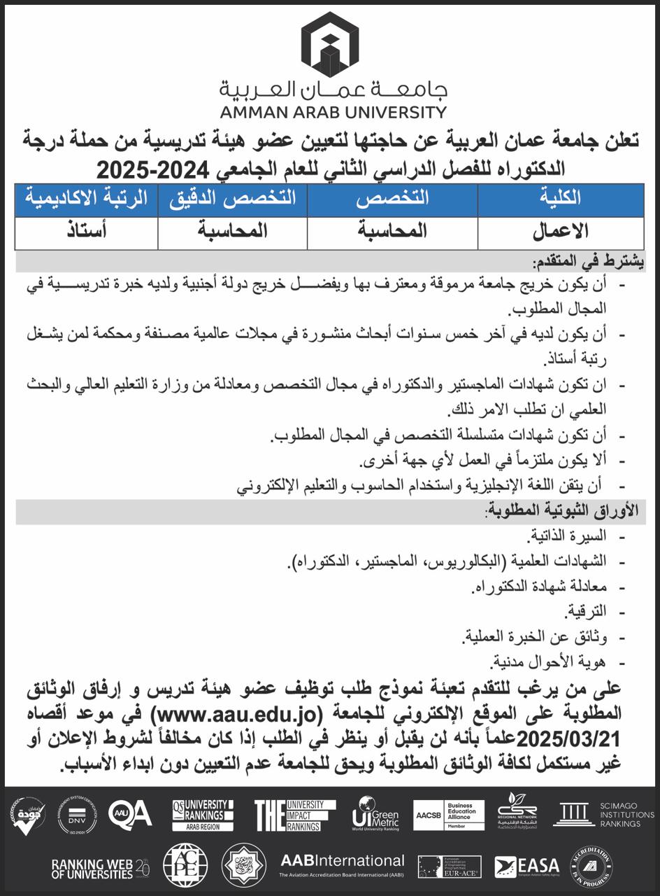 عمون - تعلن جامعة عمان العربية عن حاجتها لتعيين عضو هيئة تدريسية من حملة درجة الدكتوراه للفصل الدراسي الثاني للعام الجامعي 2024-2025 |