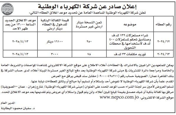 عطاءات صادرة عن شركة الكهرباء الوطنية