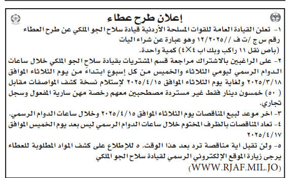 عطاءات صادرة عن القيادة العامة للقوات المسلحة الاردنية