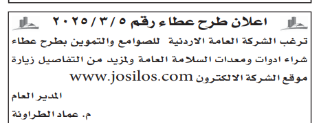 عطاء صادر عن الشركة العامة الاردنية للصوامع والتموين