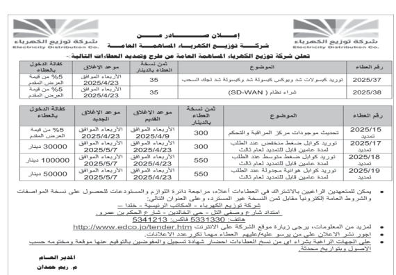 عطاءات صادرة عن شركة توزيع الكهرباء