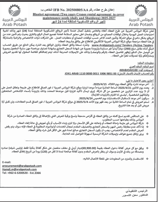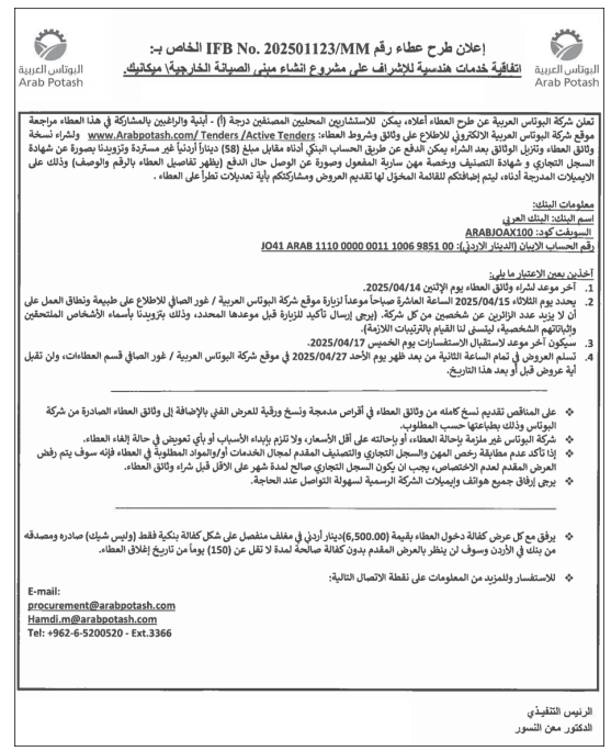 عطاءات صادرة عن شركة البوتاس العربية