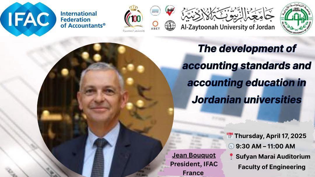 عمون - تستضيف جامعة الزيتونة الأردنية، بالتعاون مع المجمع الدولي العربي للمحاسبين القانونيين (طلال أبو غزالة العالمية)، حدثًا محاسبيًا أكاديميًا عالميًا، يتمثل في لقاء مفتوح مع رئيس الاتحاد الدولي للمحاسبين القانونيين (IFAC)، الدكتور جون بوكو (Dr. Jean Bouquet)، وذلك يوم الخميس الموافق 17 نيسان 2025 من الساعة 9:30 صباحًا وحتى 11:00 صباحًا في مدرج الحاج علي القرم بكلية الأعمال. ويأتي هذا اللقاء لمناقشة سبل تطوير معايير المحاسبة الدولية وآليات تدريسها في الجامعات الأردنية، من خلال إستضافة أعضاء الهيئات التدريسية، والمحاسبين، والمديرين الماليين، والمتخصصين في القطاعات المالية والخدمية والصناعية، إضافة إلى طلبة البكالوريوس والدراسات العليا وكل المهتمين بعالم المحاسبة، في فرصة مميزة للاطلاع على أحدث التوجهات في هذا المجال الحيوي |