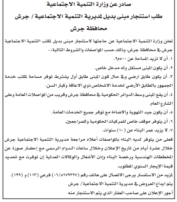 عطاء استئجار مبنى بديل لمديرية التنمية الاجتماعية لمحافظة جرش