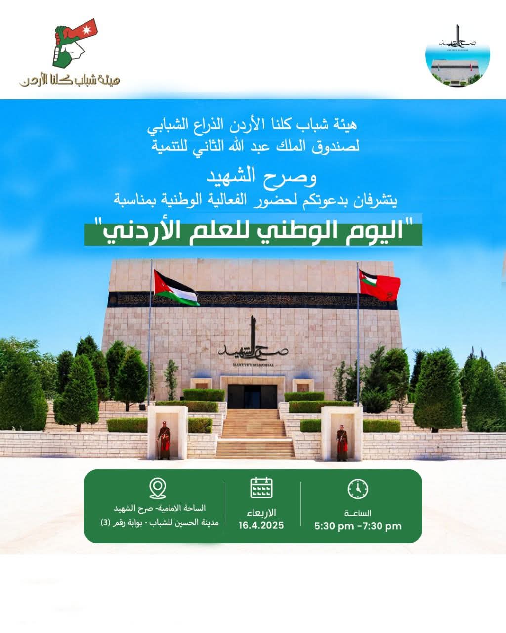 عمون - دعت هيئة شباب كلنا الاردن - الذراع الشبابي لصندوق الملك عبدالله الثاني للتنمية وصرح الشهيد لحضور فعالية "اليوم الوطني للعلم الأردني".