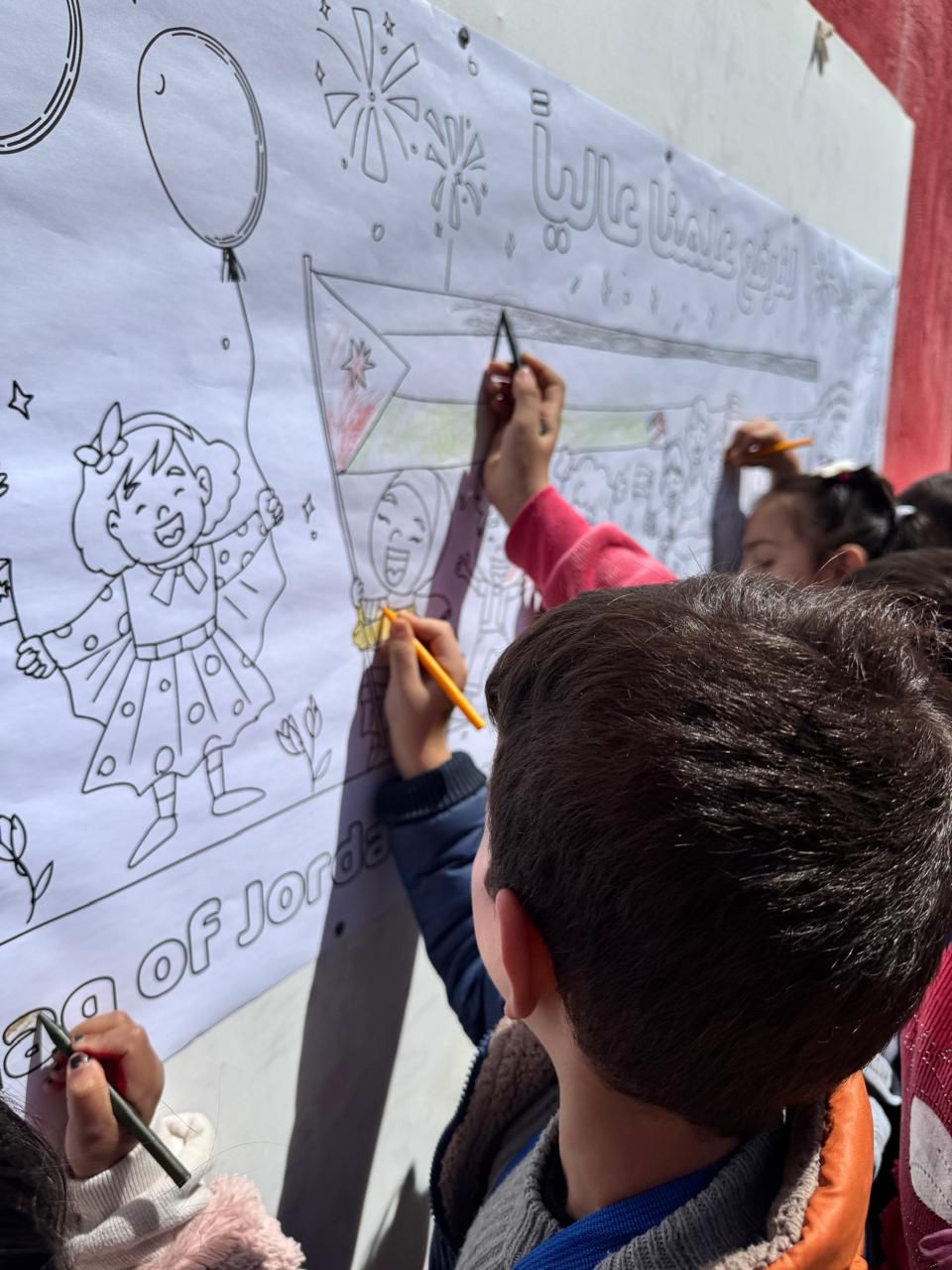كما رسم الأطفال لوحة جدارية علم الأردن و قاموا بتلوينها بأجواء وطنية تعبر عن فرحتهم بهذه المناسبة ذات الدلالات الوطنية.