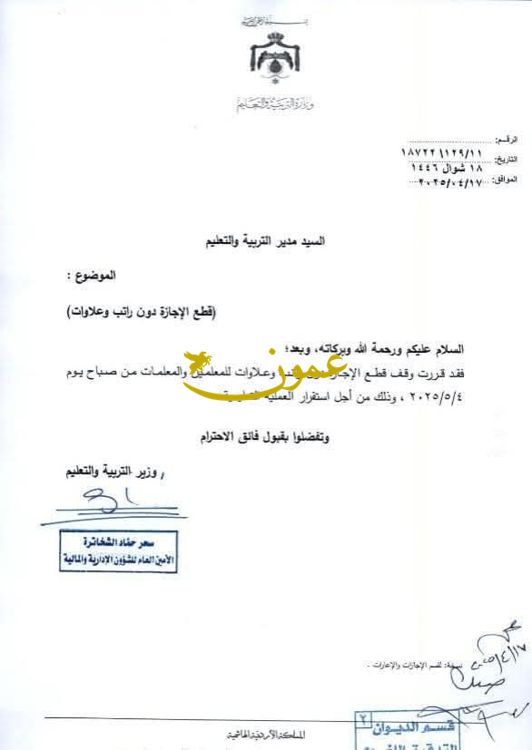 عمون - ينال المعاني - قررت وزارة التربية والتعليم وقف قطع الاجازة بدون راتب وعلاوات للمعلمين والمعلمات بدءا من صباح يوم 4/5/2025.