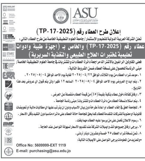 عطاء صادر عن جامعة العلوم التطبيقية الخاصة