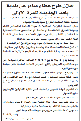 عطاء تنفيذ خلطة اسفلتية لشوارع بلدية بلعما الجديدة
