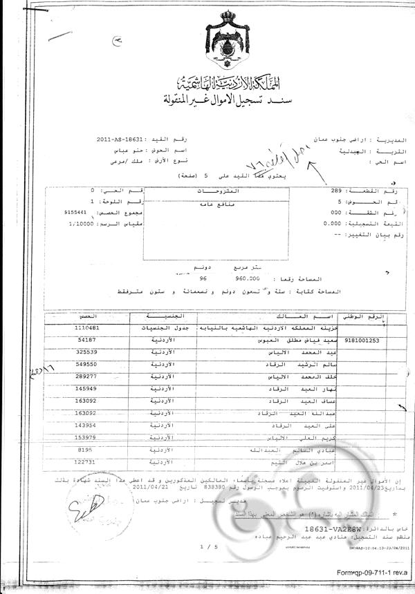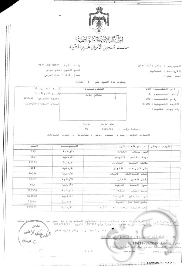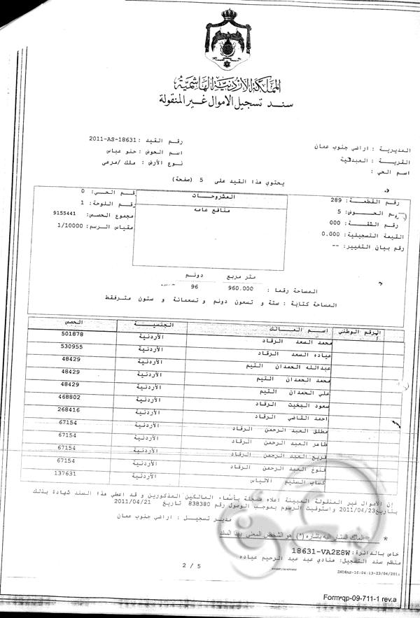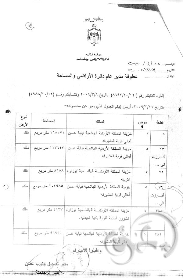 ومن الجدير ذكره أن هذه الأرض هي " جذر القرية " وتقطنها أكثر من 100 أسرة ومقام عليها منازل ومدارس ومركز صحي منذ عشرات السنين .. والأمر المهم أن مدير المخابرات السابق احد ورثة جده لابيه المرحوم سالم ارشيد الرقاد في القطعة المذكورة والذي ما زالت الارض مسجلة باسمه ولم يتم لغاية الان تسجيلها باسم الورثة .. وبالرجوع إلى قيود دائرة الأراضي والمساحة فقد كانت هذه الأرض مسجلة باسم " إمارة شرق الأردن " بالنيابة عن أهالي قرية المشيرفة ثم أصبحت باسم خزينة المملكة بالنيابة عن أهالي قرية المشيرفة وبقيت كذلك الى ان تم تنظيم القرية حسب قانون التنظيم لغاية عام 1998 .. ونتيجة لعدم اهتمام الأهالي باستخراج سندات التسجيل للأرض لتسليمهم بملكيتها من جهة ولوجود العدد الهائل من الورثة من جهة اخرى فقد حدث ان وقع احد موظفي الضابطة الحرجية في " لبس " ظنا منه ان الارض هي من اراضي الخزينة وقام بتنظيم كشوف اعتداء لاهالي القرية على الارض دون الرجوع الى سجلات دائرته المختصة .. وعندنا اكتشفت دائرة الأراضي هذا الخطأ قامت باصدار سند تسجيل بالارض باسم اجداد اهالي القرية وعددهم 59 شخصا معظمهم من مواليد القرن الثامن عشر وبداية القرن التاسع عشر ولم يتبقى منهم على قيد الحياة سوى شخصان .. مرفق رقم " 2 " وذلك بعد ان أفرزت الى القطعة رقم 288 باسم الخزينة ( ارض المدارس والبلدية والمركز الصحي ) والقطعة رقم 289 والتي هي مدار الحديث .والبالغة مساحتها نحو 96 دونما . مرفق رقم ( 3 + 4 ) .