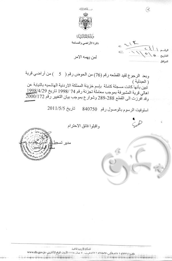 هذه الوثائق الرسمية التي أردنا ان نضعها بين يدي مواطننا الواعي تؤكد بما لا يدع مجالا للتشكيك ملكية المدير السابق للمخابرات العامة لجزء من قطعة الارض المذكورة ارثا عن جده لابيه .. وليس اعتداء على ارض الدولة كما زعم البعض .. وعليه فالأمل كبير بان تتحرى الصحافة الدقة والموضوعية والمهنية قبل أن تتهم الشرفاء من ابناء الوطن بناء على إشاعات القصد منها فقط الإساءة لسمعتهم .. متمنين لو انها تريثت قليلا لتأخذ الحقيقة صورتها الكاملة بما ينبثق عن اللجنة التي شكلها مجلس النواب للتقصي حول ملكية الاراضي للمسؤولين وكافة المواطنين الذين اعتدوا على اراضي خزينة الدولة . .. والتي نامل ان تعمل بشفافية بالعودة الى سجلات دائرة الاراضي لبيان هذه الاعتداءات .