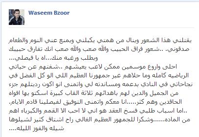عمون - ودع نجم النادي الفيصلي وسيم البزور جمهور فريقه بكلمات كتبها فجر الثلاثاء على صفحته الخاصة على موقع التواصل الاجتماعي " فيسبوك " .