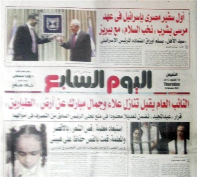 وين تصدر هاي جريدة اليوم السابع التي في الخبر أعلاه وناشرة صورة سفير مصر تحت عنوان : أول سفير مصري في عهد الرئيس مرسي يشرب نخب السلام مع بيرز