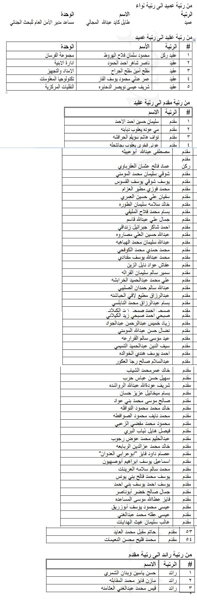 ابارك للجميع المكرمة الملكية السامية بالترفيع والتهاني الحارة للاخ عيد القرارعه ومزيدا من التقدم والرقي