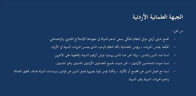 العلمانية في دولة إسلامية مجاورة لبلاد الحرمين الشريفين؟؟!!...إني أرى عدم إعطاء هذه المجموعه التي خرجت عن الدين وعن العادات والتقاليد أي اهتمام.... وأطالب أجهزة الدولة بالتصدي لهؤلاء الذين يريدون تقويض الأمن المجتمعي في الأردن باسم الحريات... إن كنتم لا تريدون الصلاة أو الصيام فهذا شأنكم وليكن داخل منازلكم وحسابكم على الله