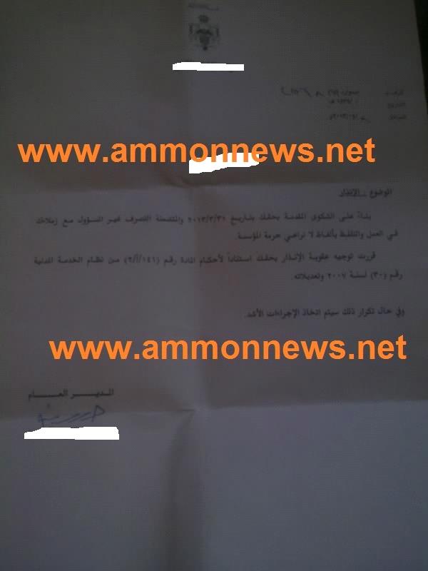 عمون - ماجد الدباس - وجه مدير عام مؤسسة رقابية إنذارا ونقلا للموظف (ع.أ.ح.ع)، إثر قيامه بإخراج ريح ، تبعا لرواية الموظف.