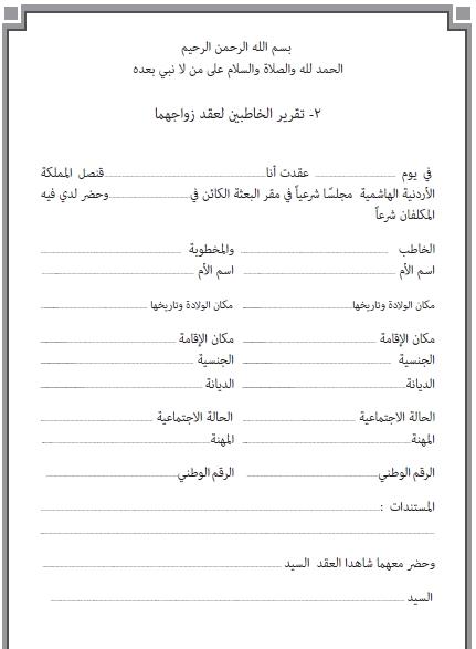 1- إعداد تقرير الزواج و يشمل على ما تم تسجيله من معلومات على الاستدعاء او الطلب المقدم وهذا التقرير ملزم للخاطبين بعد ذلك والمرفق صورة عنه :