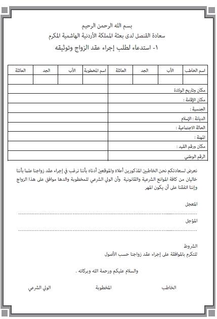 5 ـ عقود الزواج التي يكون أحد الطرفين فيها أردنيا والآخر من رعايا أي من الدول التالية ( السعودية , تونس , اليمن , الفلبين ، سيريلانكا, البحرين , الكويت ) فيجب بناء على طلب هذه الدول إرفاق موافقة هذه الدولة على إجراء عقد الزواج لمن هو من رعاياها .