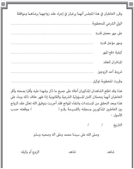 أ- تقديم استدعاء من الخاطبين يشتمل على كل من اسم الخاطب و المخطوبة كاملا والرقم الوطني و الجنسية و تاريخ الميلاد لكل واحد منهما و الولي الشرعي للمخطوبة.