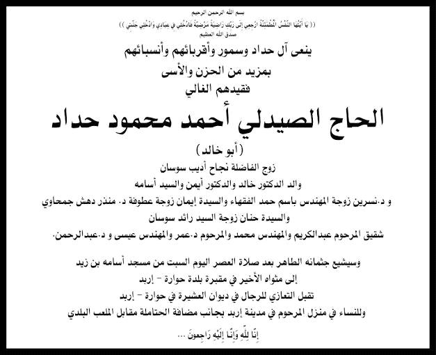 انا لله وانا اليه راجعون وعظم الله اجركم تعازي الحارة لزميل الدراسة الاستاذ اسامه حداد ولاشقائة الدكتور خالد و الدكتور ايمن احسن الله عزائكم و الهمكم الصبر والسلوان .