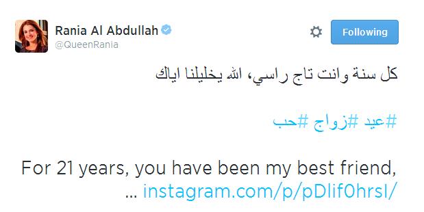 صدقت جلالة الملكة . و ابو حسين تاج روسنا. مبروك لجلالة الملك عبد الله الثاني و جلالة الملكة رانيا العبد الله عيد الزواج السعيد. و الشعب يفتخر بمليكه و هو يمثل الأب المخلص لأسرته . و إن شاءالله ربنا يديمكم و يحفظكم و عيد زواج سعيد. و تهانينا لسيد البلاد بعيد الجيش و عيد الجلوس الملكي. الشعب الأردني أسرة واحدة بقيادة الملك الانسان عبد الله الثاني ابن الحسين المعظم