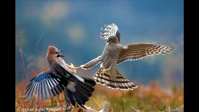 وفاز بالمركز الأول فى قائمة صور الطيور هو بال هرمانسن من النرويج عن صورته طائري الميسان وأبو زريق.