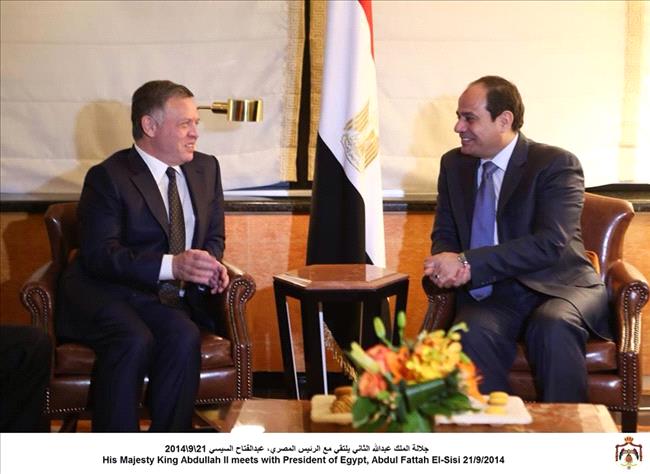 الى ذلك ،، التقى جلالة الملك عبدالله الثاني في نيويورك مساء الأحد، الرئيس المصري عبدالفتاح السيسي، الذي يرأس وفد بلاده إلى اجتماعات الدورة التاسعة والستين للجمعية العامة للأمم المتحدة، وبحث معه العلاقات الثنائية في مختلف المجالات السياسية والاقتصادية، وتطورات الأوضاع في الشرق الأوسط.
