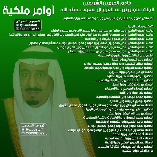 ولا يرى مراقبون وجود تغييرات بارزة على صعيد مجلس الوزراء، بإستثناء الدمج الحاصل في وزارتي التعليم والتعليم العالي واعفاء وزير التعليم الامير خالد الفيصل منها وتعيين الدكتور عزام الدخيل وزيراً للتعليم.