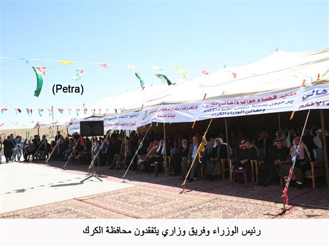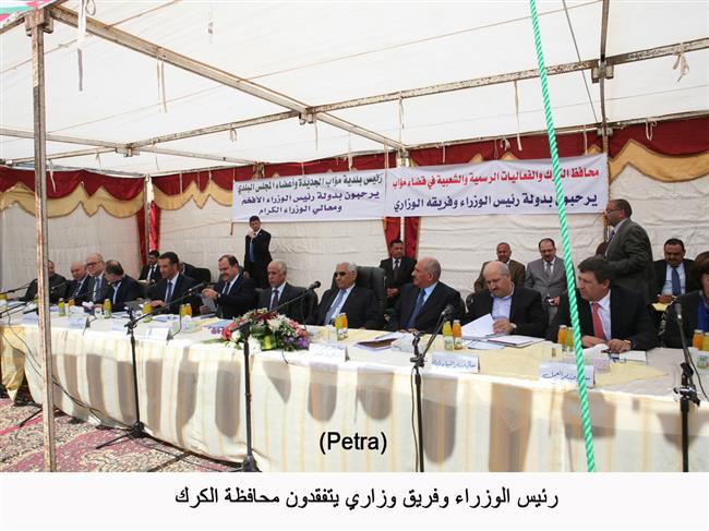 وخلال زيارته الى قضاء مؤاب ولقائه شيوخ ووجهاء واهالي القضاء، قال رئيس الوزراء عقب استماعه لمطالب المواطنين وممثليهم "لقد سمعنا اليوم نفسا طيبا من التلاحم والقوة والصمود والاعتزاز بهذا البلد الصغير في مساحته وسكانه وموارده لكنه قوي بقيادته ووعي شعبه".
