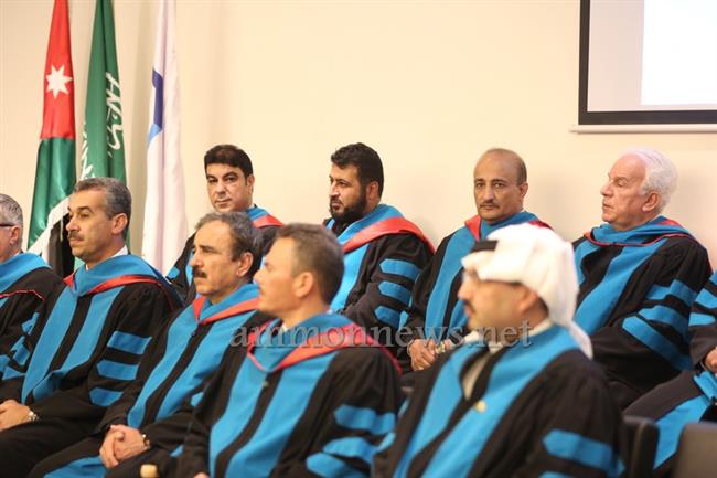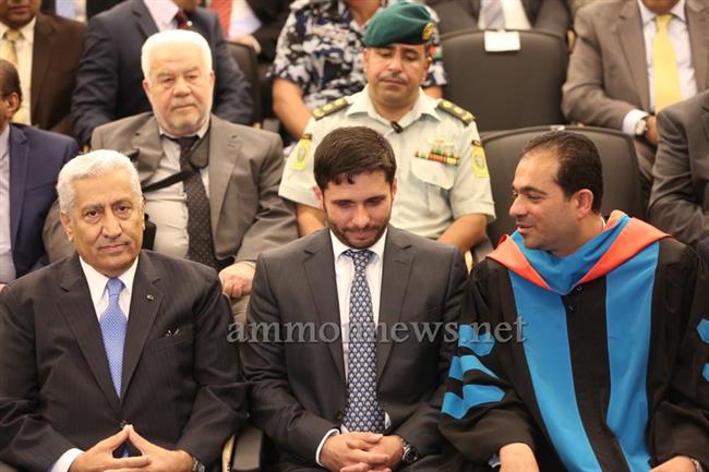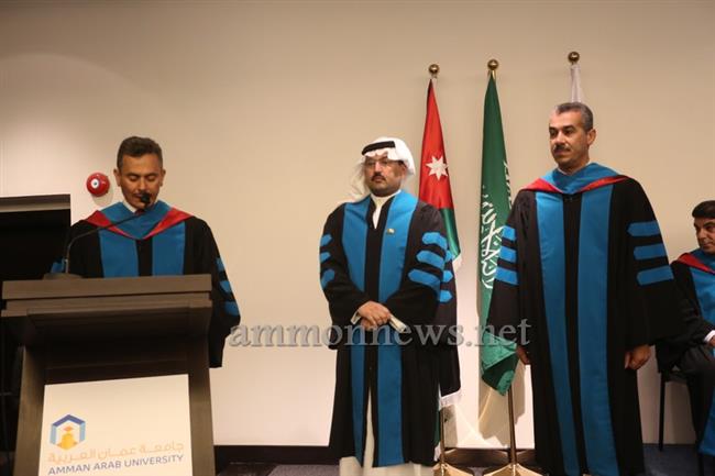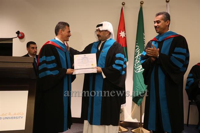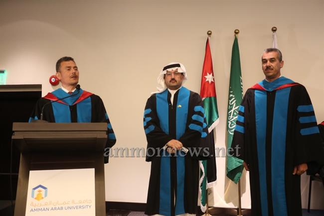 عمون - بحضور سمو الامير حمزة بن الحسين ورئيس الوزراء الدكتور عبد الله النسور ووزير الداخلية حسين المجالي كرمت جامعة عمان العربية اليوم سمو الامير تركي آل سعود ومنحته شهادة الدكتوراه الفخرية بـ الادارة.