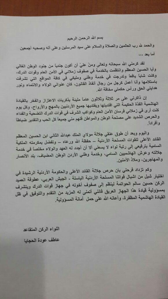 ترفيع عاطف الحجايا إلى رتبة لواء وإحالته الى التقاعد (رسالة شكر)28-05-2015 09:59 PM